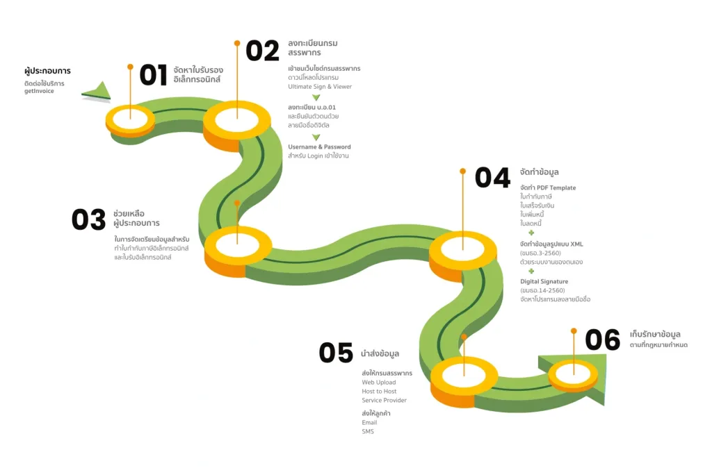 getInvoice จัดทำเอกสาร PDF/A-3 ตามข้อเสนอแนะมาตรฐานฯ ว่าด้วยการจัดทำหนังสือรับรองในรูปแบบอิเล็กทรอนิกส์ เลขที่ ขมธอ. 3-2560 ตามรูปแบบเอกสารใบกำกับภาษีและใบรับที่เป็นมาตรฐาน และสามารถขอใช้บริการให้ทำตามที่บริษัทต้องการได้ และจัดทำไฟล์ XML ตามข้อเสนอแนะมาตรฐานด้านเทคโนโลยีสารสนเทศและการสื่อสารที่จำเป็นต่อธุรกรรมทางอิเล็กทรอนิกส์ ว่าด้วยข้อความอิเล็กทรอนิกส์สำหรับการซื้อขายสินค้าและบริการ ขมธอ. 3-2560 รวมทั้งลงลายมือชื่อดิจิทัล (Digital Signature) ให้กับเอกสาร PDF/A-3 และ ไฟล์ XML